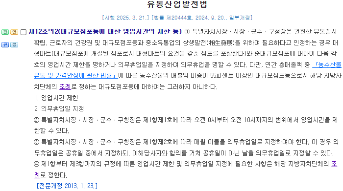 실제로 「유통산업발전법」 제12조의2에 따르면, 시장ㆍ군수ㆍ구청장 등 지방자치단체장은 유통질서 확립과 중소상인 보호를 위해 대형마트 및 준대규모점포에 대해 영업시간을 제한하거나 매월 이틀의 의무휴업일을 지정할 수 있도록 되어 있습니다. 단, 농수산물 매출 비중이 55% 이상인 점포는 조례에 따라 예외로 둘 수 있으며, 이 모든 기준은 각 지자체의 조례로 정하도록 규정하고 있습니다.