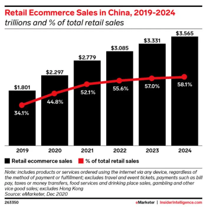 둘째, 전자상거래의 급성장입니다. 중국에서는 온라인 쇼핑이 2019년 전체 소매의 약 34%를 차지하던 수준에서, 2021년에는 50%를 넘어 설 정도로 폭발적으로 성장했습니다. 2024년에는 전체 소매의 절반 이상(약 58%)이 온라인을 통해 이뤄질 것으로 예상됩니다.