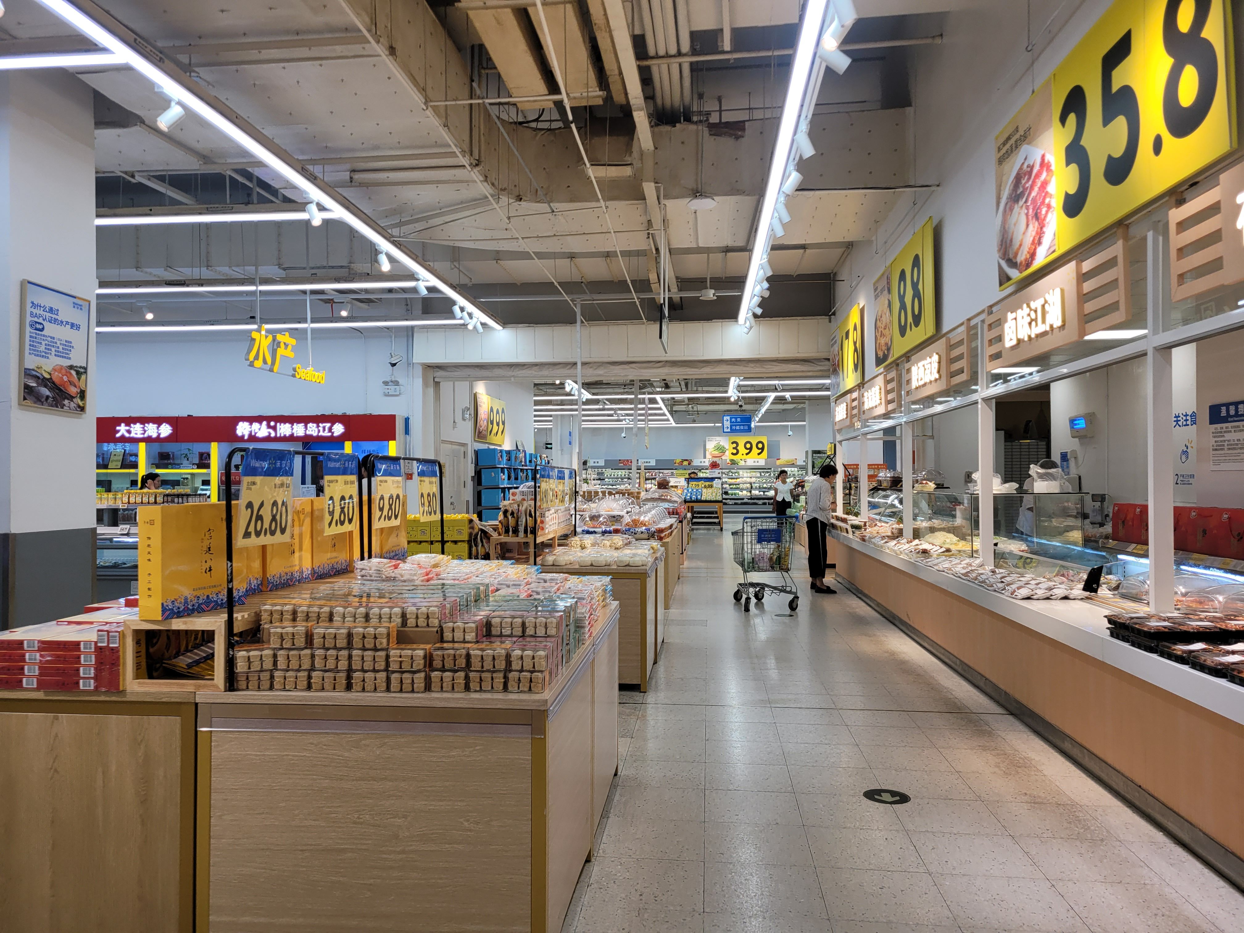 매장은 전반적으로 깔끔하게 관리되고 있었습니다. 중국 내 다른 할인점인 Yonghui나 Wumart 매장은 다소 노후화된 인상을 주는 경우가 많았는데, 월마트는 상대적으로 관리 상태가 좋아 쾌적한 쇼핑 환경을 제공했습니다. 제가 방문한 Fuzhuo Commercial점은 1층과 지하 1층을 모두 활용한 대형 매장 구조였습니다.