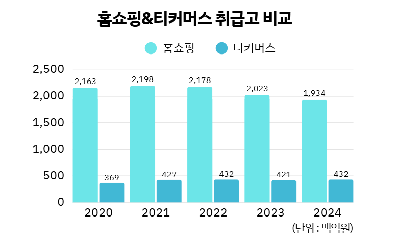 2024년 기준, 홈쇼핑의 취급고는 T커머스보다 약 4.5배 큽니다.